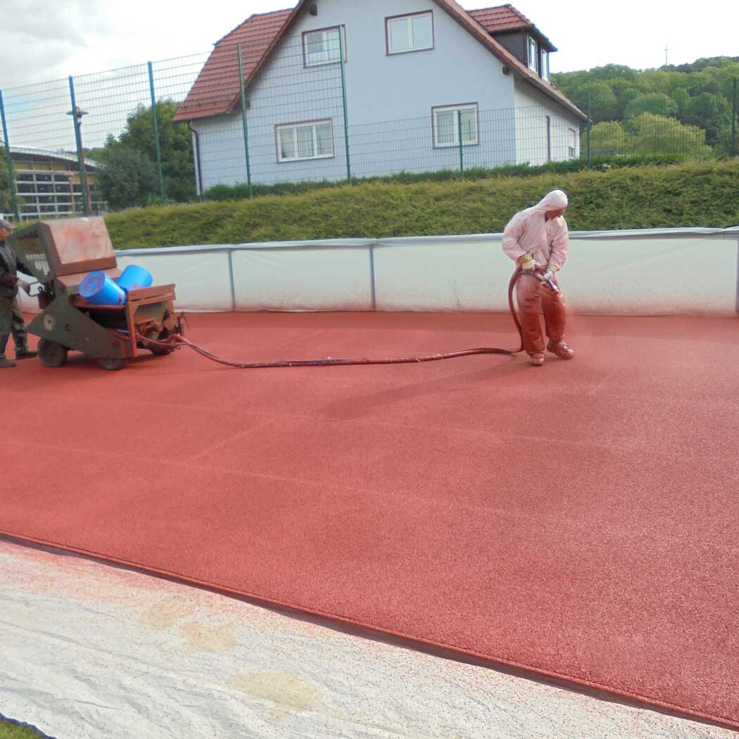 Alternativ wird eine PUR-Spritzbeschichtung mit EPDM-Granulaten aufgebracht. Anschließend wird die Oberfläche mit Linien versehen.